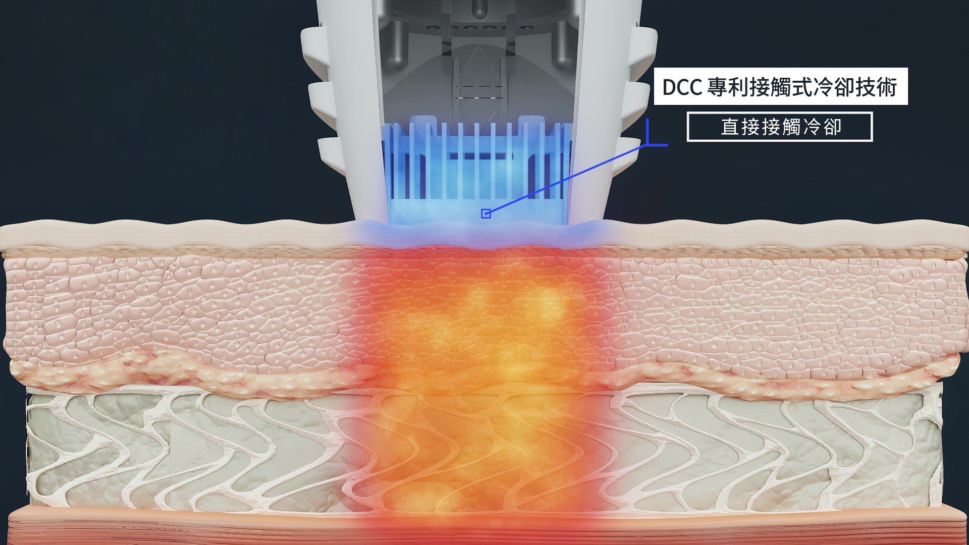 在能量釋放的同時,探頭持續以低溫接觸皮膚表層,減少熱感,並保護表皮免受高溫傷害。