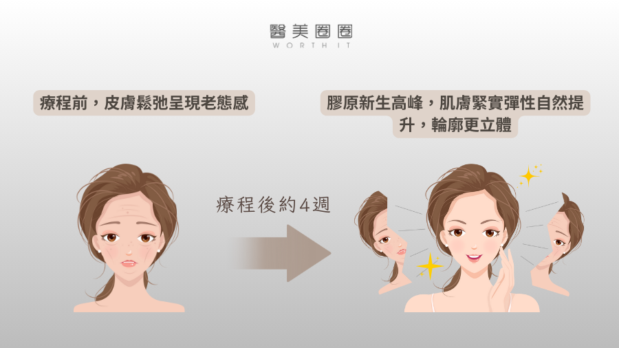 一般來說,在療程後約4週左右達到膠原新生高峰,皮膚緊實度和彈性會逐漸明顯,呈現自然緊緻的輪廓。