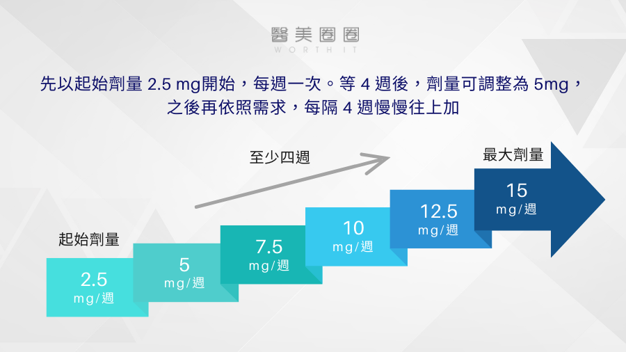4 週後可增加至 5 mg,之後每 4 週逐步增加。
