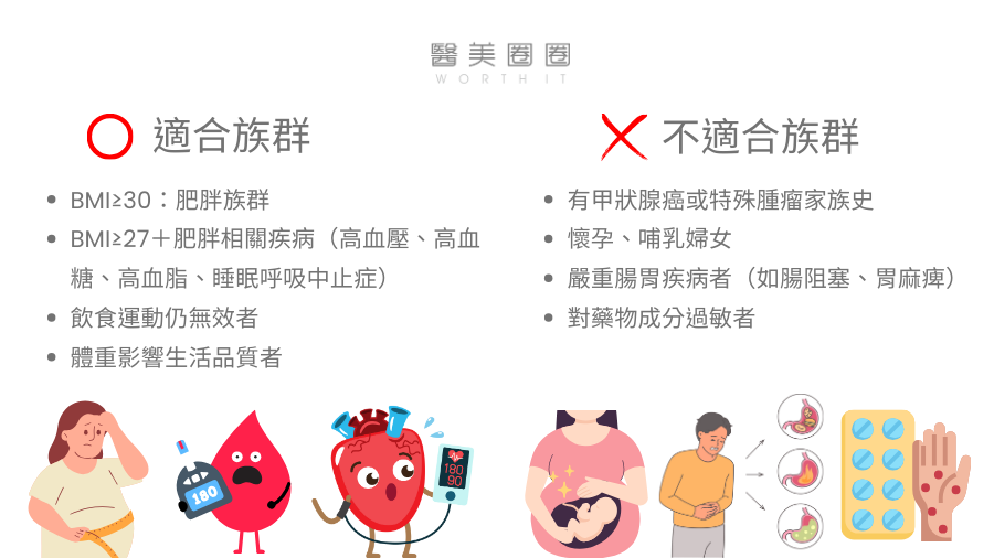 - BMI ≥27,且合併至少一項與肥胖相關的健康問題(如高血壓、高血糖、高血脂、睡眠呼吸中止症)