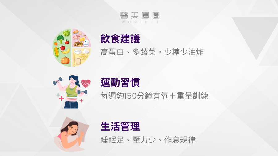 ✔ 飲食建議:以高蛋白、低精緻澱粉、蔬菜為主,避免高糖與高油炸食品。