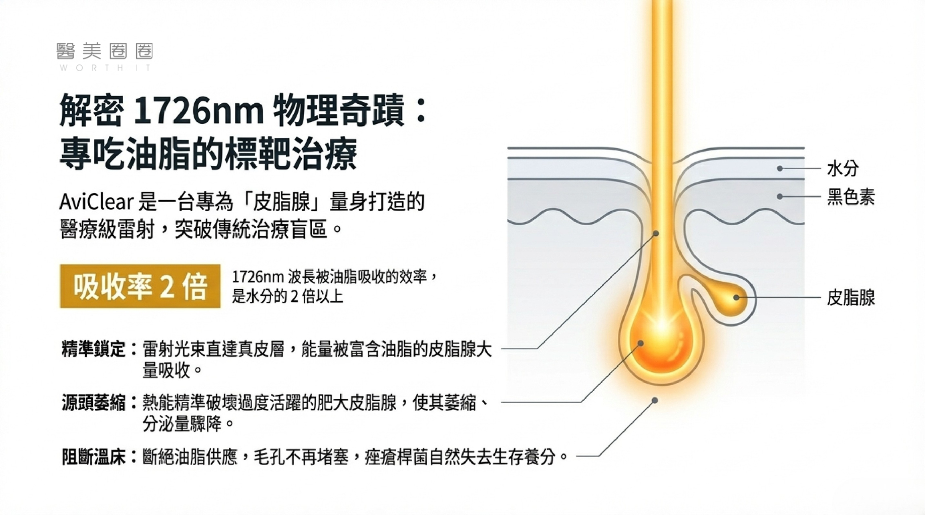 在雷射醫學中,不同的波長會被不同的目標物(如黑色素、血紅素、水分)吸收。1726nm 這個波長非常特殊,它在人體組織中,被皮脂(油脂)吸收的效率,大約是被水分吸收的 2 倍。