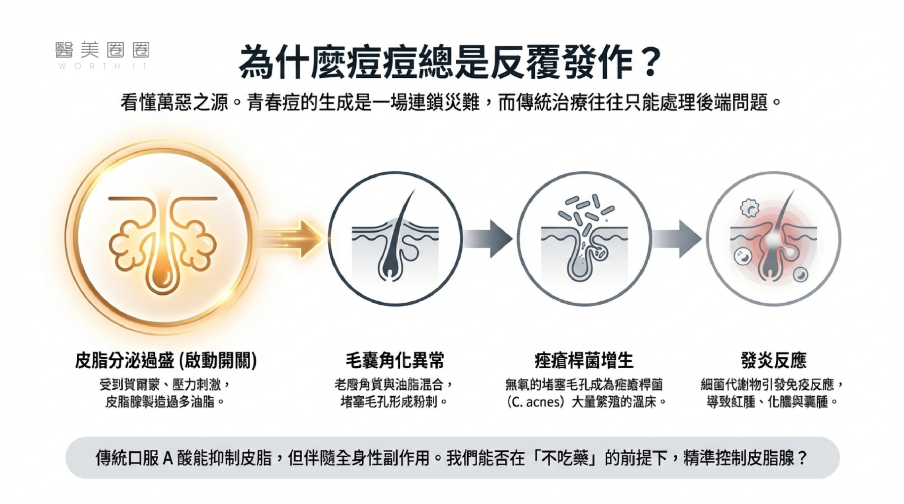 在這四個環節中,「皮脂分泌過盛」是啟動後續一連串災難的開關。傳統的治療方式,如抗生素主要針對殺菌;外用酸類主要針對去角質。唯有口服 A 酸能夠有效抑制皮脂腺分泌,這也是為什麼口服 A 酸過去被視為治療嚴重痘痘的終極武器。