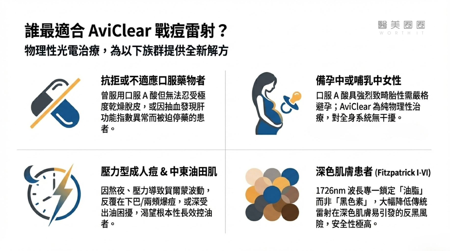 - 深色肌膚患者: 過去許多雷射(如脈衝光、某些淨膚雷射)在深色肌膚上容易引發熱傷害或色素沉澱(反黑)。AviClear 的 1726nm 波長針對的是「油脂」而非「黑色素」,因此適用於 Fitzpatrick 膚色分類的 I 到 VI 型(包含極深色肌膚),安全性極高。