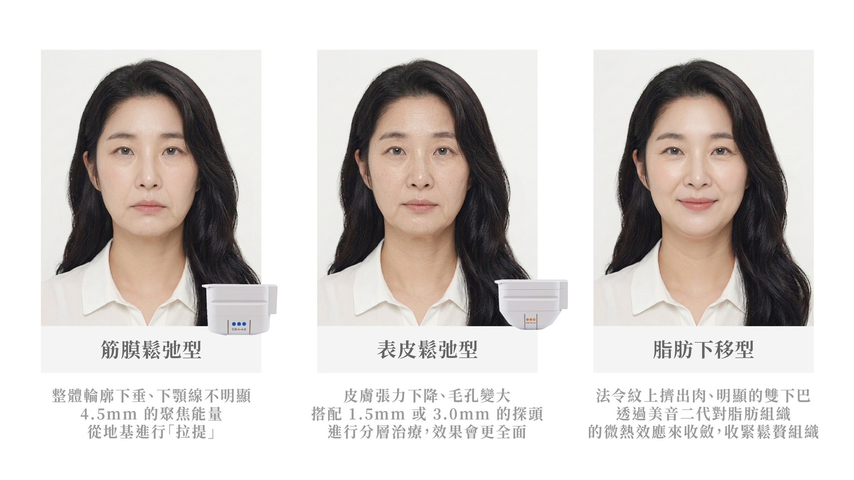 有些人老化表現是法令紋上方擠出一塊肉,或是出現明顯的雙下巴。這類族群除了筋膜拉提,還需要美音二代對脂肪組織產生的微熱效應來進行收斂,收緊鬆贅組織,恢復線條的俐落感。